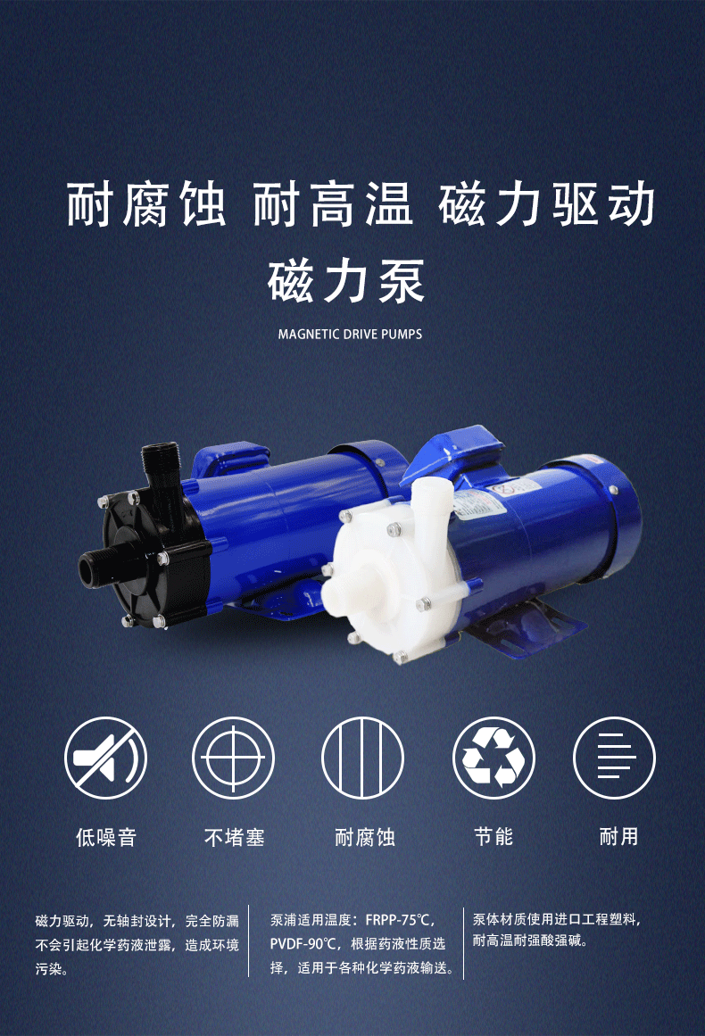 MP小型耐腐蝕磁泵。因為顧客添加的藥液中含有大量的濃硫酸,腐蝕性很強,液體的比重也比較法,所以需要一個耐強酸的泵,進(jìn)行加藥。本人推薦采用PVDF氟塑料材料制成的耐腐蝕磁力加藥泵,磁力泵最小可達(dá)25L/min,非常符合顧客小流量的要求。